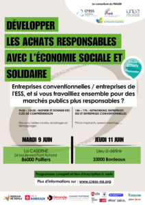 Suite à la réussite de la journée « Développer les achats responsables avec l’ESS » de 2025, le consortium du PRASER (Parcours Régional des Achats Socialement et Écologiquement Responsables), composé de la CRESS Nouvelle-Aquitaine, INAE, 3ARet UNEA, organise deux événements dans le cadre de la Semaine des achats socialement et écologiquement responsables (du 08 au 12 juin).